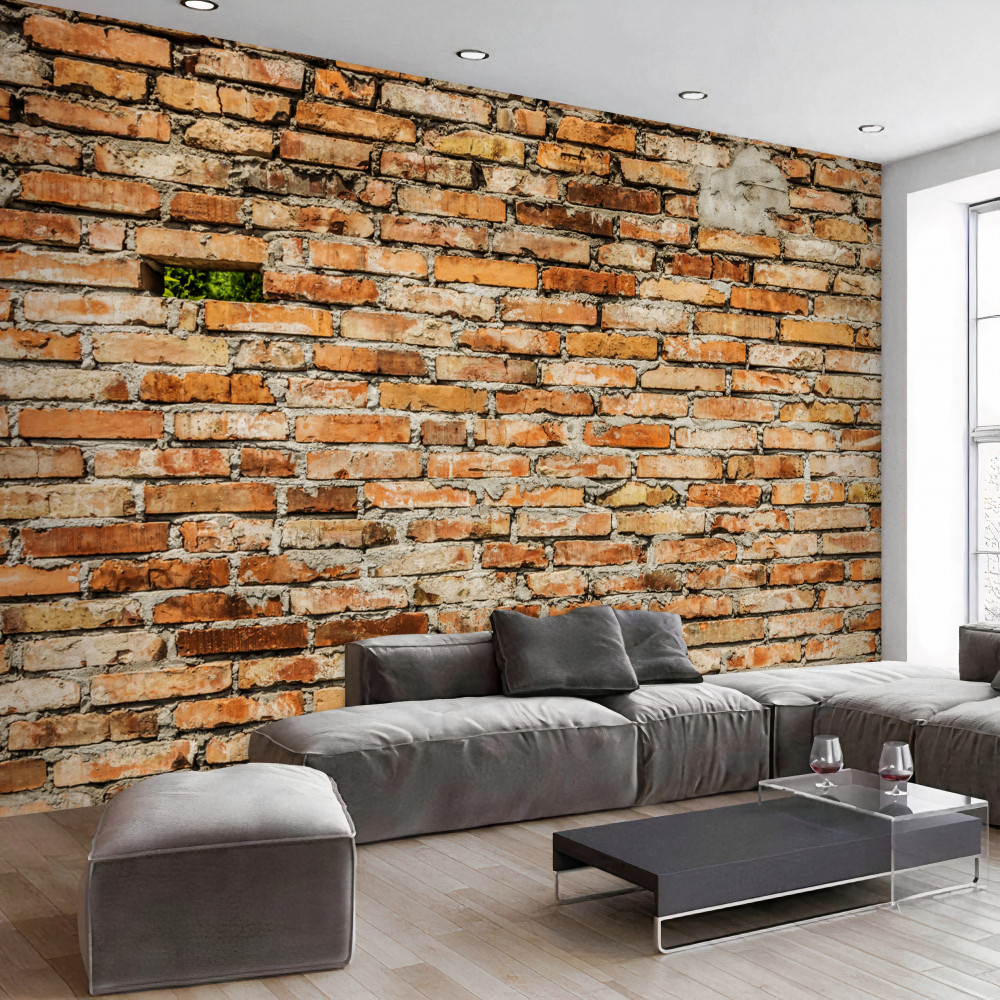 Fotobehang bakstenen muur die na verloop van tijd afbrokkelt
