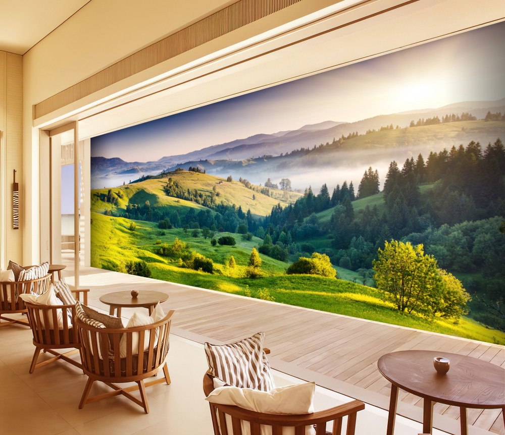 Fotobehang Rand van het bos met bomen en uitzicht op de bergen
