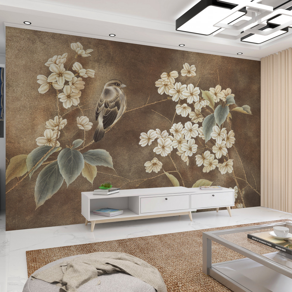 Fotobehang Vogels op een boom met witte bloemen