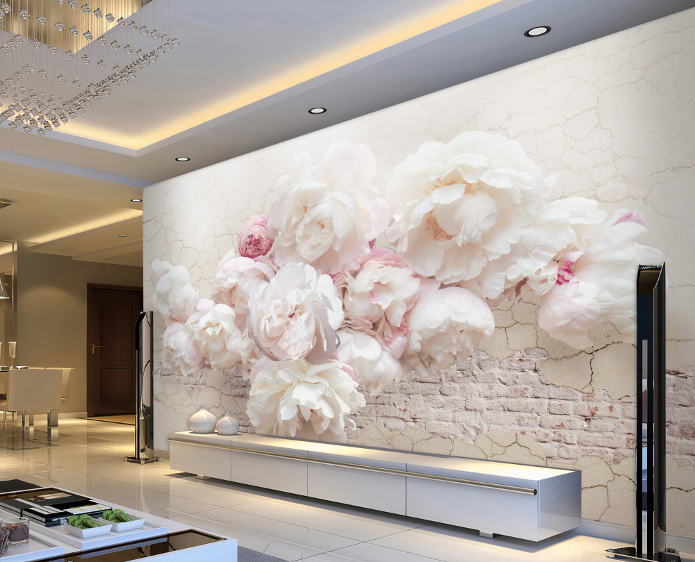 Fotobehang witte en roze knoppen op een bakstenen achtergrond