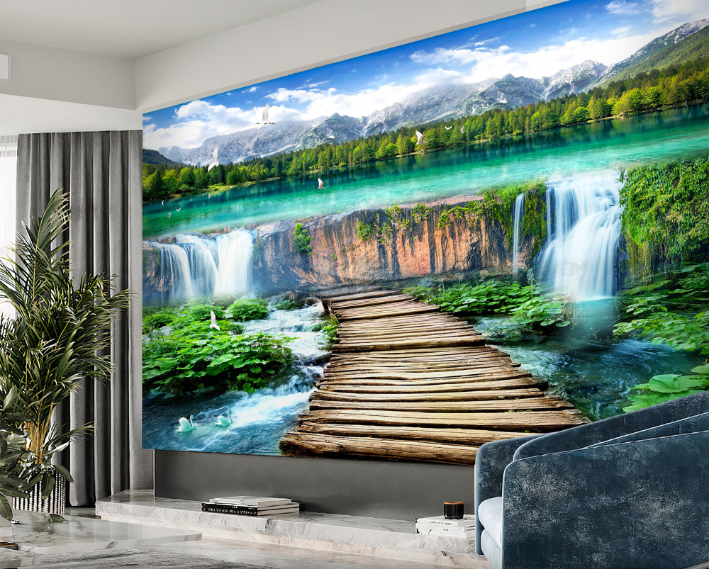 Fotobehang Kristalhelder water met zwanen bij de waterval